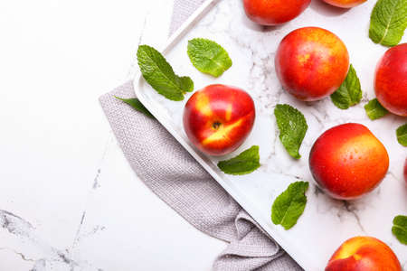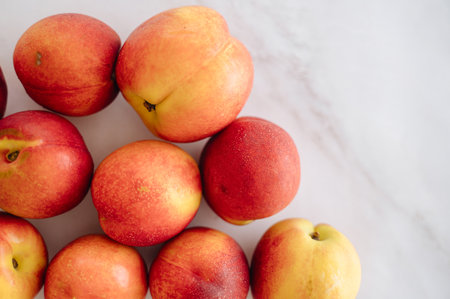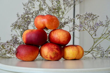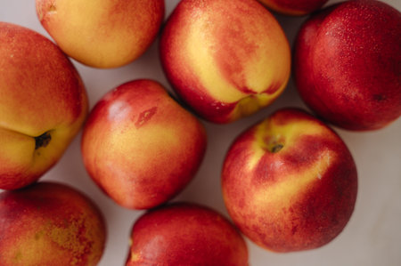 Fresh, ripe nectarines artfully arranged on a clean white table. High quality photo