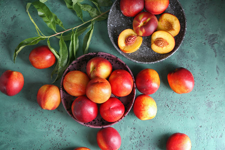 Sweet ripe nectarines in bowl on table
