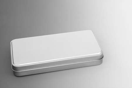 Silver coloured gift box made of brushed metal on gradient grey background. Elegant design element. Copy space.