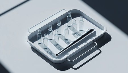 A high-angle 3D conceptual illustration featuring several clear glass vials and a sleek metallic tool arranged on a white minimalist tray, characterized by clean lines and dramatic shadows in a clinical laboratory aesthetic.