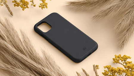 Dark gray phone case, resting on a beige surface, is presented with dried plants as a decorative element. The case's smooth and matte finish is highlighted, showcasing its simple and modern design. The natural lighting creates a soft ambiance around the product, emphasizing its sleek and protective qualities. The background provides a calm and neutral backdrop, allowing the case to stand out and emphasizing its characteristics.