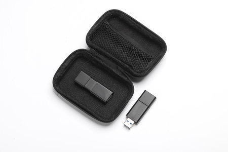 Two flash drives in case on a white background