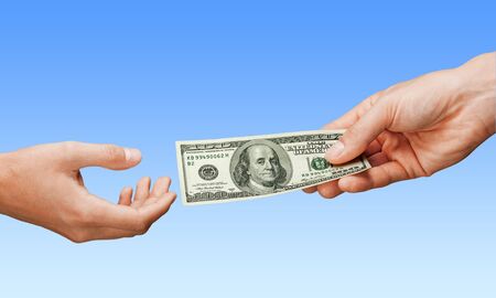 Money transfer concept. Transfers money from hand to hand against the sky.