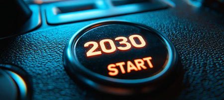 Futuristic Car Dashboard Featuring Illuminated Start Button with 2030 and Modern Design Elements