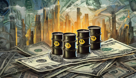 A collection of three black barrels stands beside several hundred dollar bills, emphasizing themes of finance, investment, and commodity trading in a clean setting.