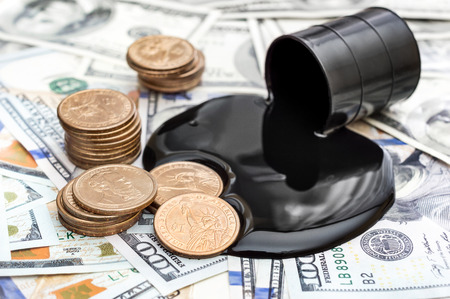 Spilled oil from a barrel on a mirror stud. Packs with dollar bills background