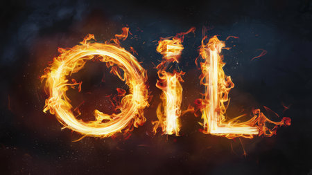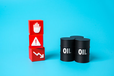 Oil barrel with the word OIL and crushed coal pieces on a blue background, symbolizing energy resources and environmental concerns, featuring industrial elements and textures