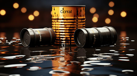 A Dark Perspective on the Black Crude Oil Barrel and Reflective Oil Spill Pollution with Ominous Background. Generative AI