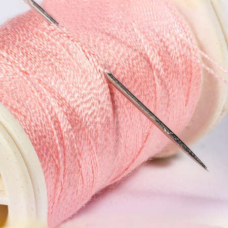 Detail view of needle in a pink spool of thread