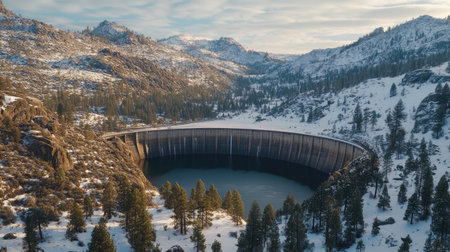 A breathtaking aerial view of a snow-covered dam nestled in a tranquil mountain landscape. Evergreen trees surround the serene reservoir, reflecting the beauty of winter.