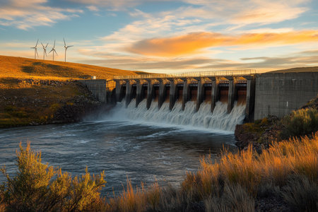 A majestic dam releasing water at sunset, with wind turbines on a hill in the background. A beautiful scene of renewable energy.