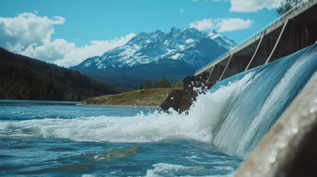 A hydroelectric dam generates power amidst a picturesque mountain landscape, showing the power of nature harnessed for sustainable energy.