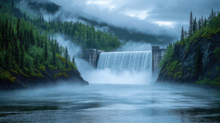 A captivating landscape unfolds with a waterfall cascading powerfully over a concrete dam, surrounded by lush green trees clinging to misty