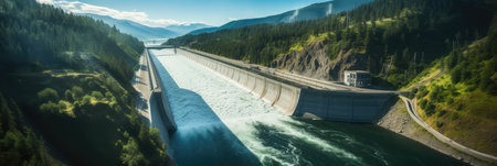 Generative AI, hydroelectric dam utilizing the flow of water to produce sustainable energy, aerial drone view,