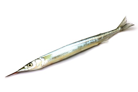 Garfish, sea needle (Belone belone) head with widely open jaws isolated on white background.