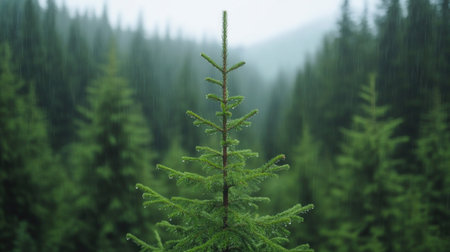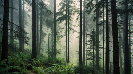 Discover a captivating misty forest landscape featuring tall evergreen trees enveloped in soft fog. This serene scene evokes tranquility and natural beauty, ideal for nature lovers.