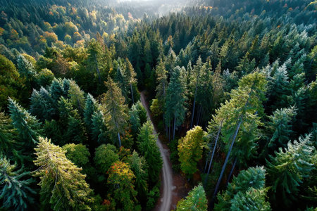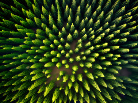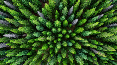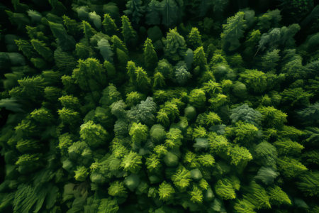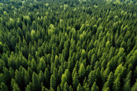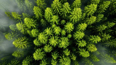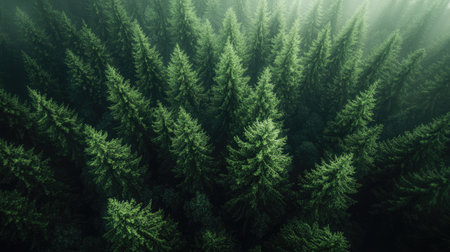 An overhead view reveals a dense forest canopy composed of numerous tall evergreen trees. The scene showcases a variety of green hues, with textures of needles and branches. The composition is framed by subdued lighting. The image suits commercial and editorial applications to depict nature or environment.