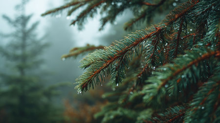 Close Up of Pine Branch with Dew in a Tranquil Forest Setting.