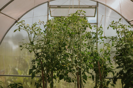 Growing green plants in a greenhouse tied with a rope in a vegetable garden in summer
