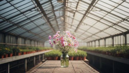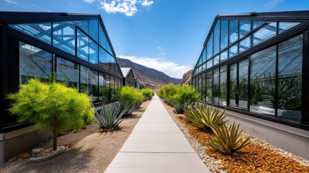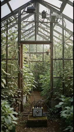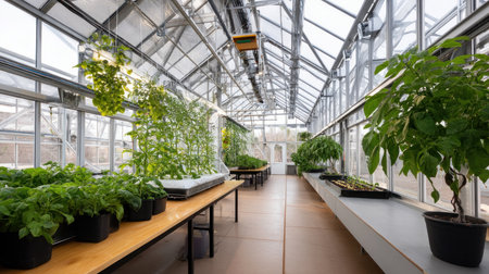 greenhouse, with view of hybrid plants thriving, created with generative ai