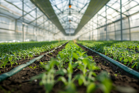 Low angle view inside a modern greenhouse, showing rows of young plants under a controlled environment with sunlight filtering through.