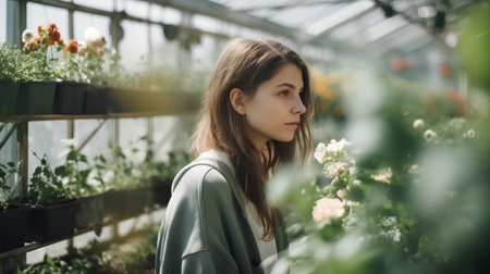 A serene woman standing in a beautiful greenhouse surrounded by vibrant flowers
