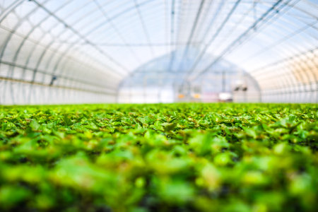 A large, modern greenhouse filled with rows of plants. Plenty of copy space available