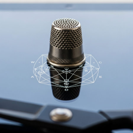 A simple yet striking composition features a black button with four holes, paired with a sleek sewing needle resting beside it on a clean, light-colored background, showing tools of craftsmanship.