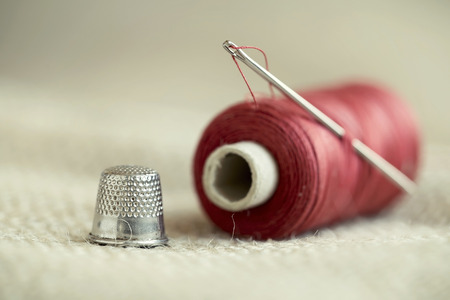 Needle in canvas with red thread for embroidery. Embroidery macro close up. View from above. Free copy space.