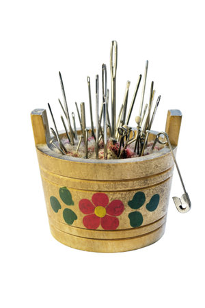 sewing needles of various sizes in a black organizer. taken in close-up with a place for text, an object, a product, or an advertisement, on a white background.