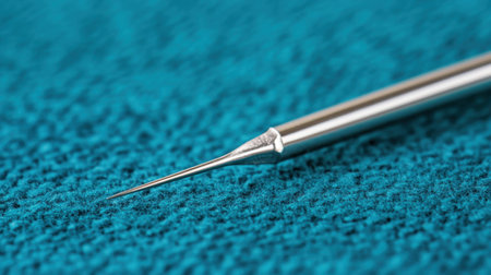 A close-up image showcasing a precision needle resting on a textured fabric background. Ideal for illustrating craftsmanship in sewing, healthcare, and embroidery.