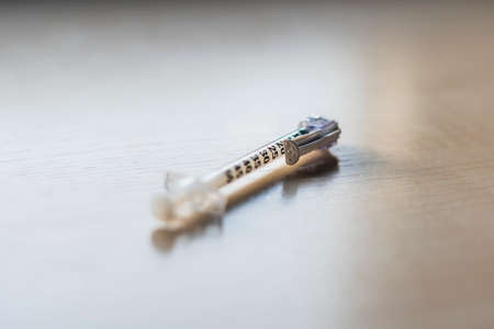Close-up of vaccine drop on syringe needle. Water drop falling from the syringe needle
