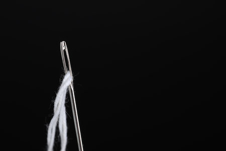 Needle with black thread on white fabric background. Horizontal composition. Top view