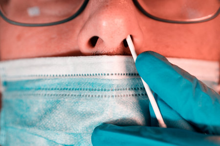Close-up of epidemiologist taking PCR test of a patient during COIVD-19 outbreak.