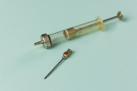 Vintage Glass Syringe and Rusted Needle on Pastel Background Historical Medical Equipment