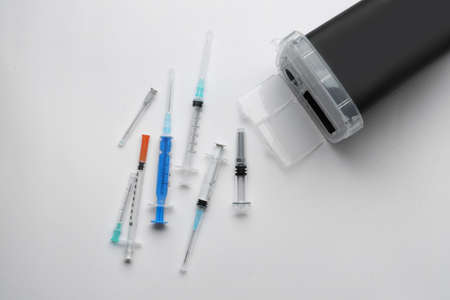 Disposable syringes with needles and sharps container on white background, top view