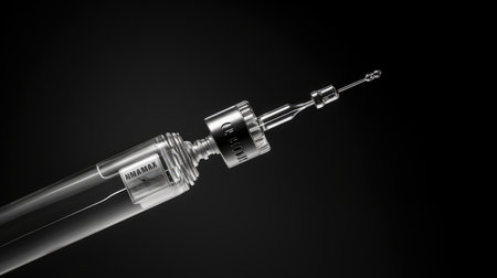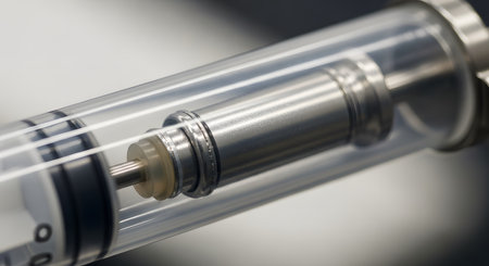 A detailed macro shot showing the inner mechanism of a medical syringe, focusing on the metal plunger and the clear barrel. The image represents precision, science, medicine, healthcare, and pharmaceutical technology.