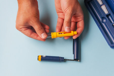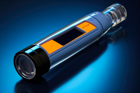 a lot of insulin syringe pens for diabetes treatment on blue background selective focus close up