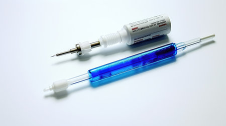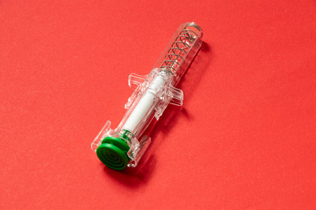 Macro photography of an pre-filled syringe with an automatic safety system