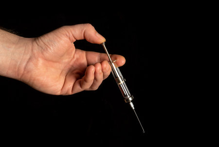 Medical syringe in man hand on black isolated background