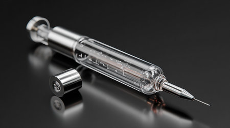 This high-resolution close-up image captures a medical syringe with a sharp needle on a sleek dark surface, perfect for healthcare, pharmaceutical, or medical-themed projects.