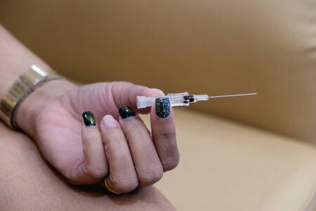 The hand of a woman with beautiful nails Holding the needle in your hand To wait for treatment