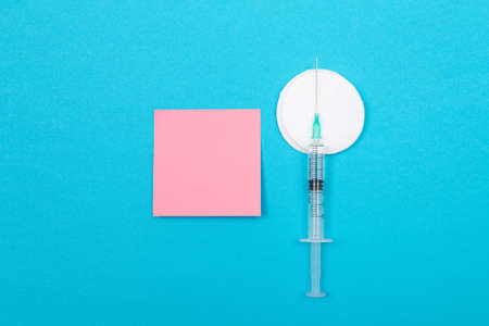 Vaccination, Immunology or Revaccination Concept - A Medical Disposable Syringe Lying on Blue Table in Doctors Office in a Hospital or Clinic. Blank Pink Sticky Note - Mock Up with Copy Space