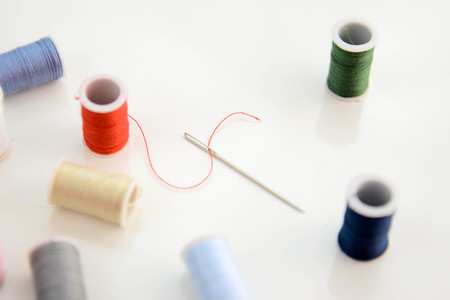 threaded needle, red thread spool, and multi colored spools. red, green, blue, orange, grey, white, tan
