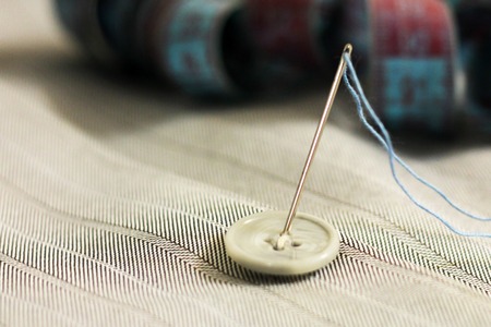 Sewing textile or cloth. Work table of a tailor. Detail of a needle with thread in the workroom reel of thread, and natural fabric. . Shallow depth of field. Focus on needle.
