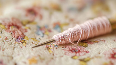 Needle threaded with pastel pink sewing thread, lying on a floral printed fabric close-up