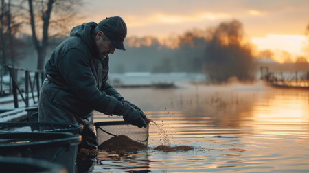 Fish farmer feeding fish at dawn, illustrating aquaculture and sustainable fish farming.