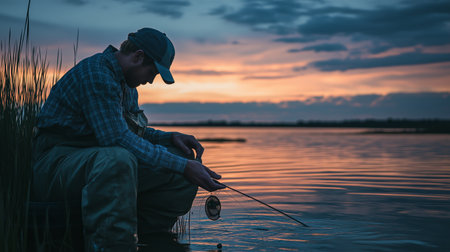 A fisherman prepares his tackle as the sun sets over the calm waters of a serene lake during a peaceful evening outing