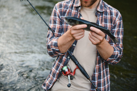 Young Man Fly Fishing in a River Surrounded by Lush Greenery, Summer Outdoor Activity