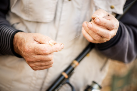 Close-up of a fisherman putting on bait with fishing equipment box. Fishing and sport concept.